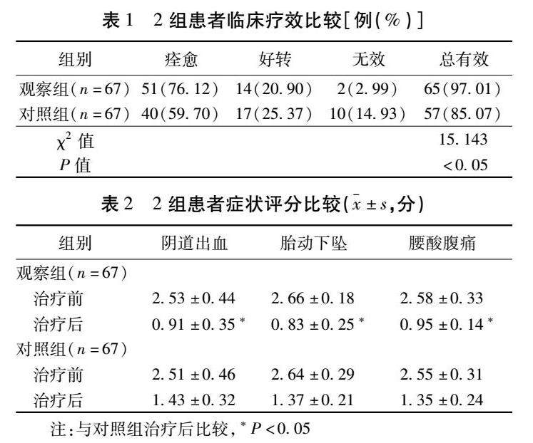 摘要 目的:观察胎动不安患者联合应用地屈孕酮、中药足浴治疗的临床效果。方法:选取2021年9月至2022年9月福建省南平市松溪县妇幼保健院收治的胎动不安患者134例作为研究对象,按照随机数字表法分为对照组和观察组,每组67例。对照组予以地屈孕酮治疗,观察组予以地屈孕酮+中药足浴治疗。结果:观察组临床疗效高达97.01%,较对照组更高,差异有统计学意义(P<0.05);观察组阴道出血、胎动下坠、腰酸腹痛等症状评分较对照组更低,差异均有统计学意义(均P<0.05);观察组血清雌二醇、孕酮、人绒毛膜促性腺激素(HCG)表达水平较对照组更高,差异均有统计学意义(均P<0.05);观察组抑郁/焦虑情绪评估得分、睡眠质量评估得分较对照组更低,差异均有统计学意义(均P<0.05);观察组与对照组恶心、过敏、头痛等不良反应比较,差异无统计学意义(P>0.05)。(剩余6942字)