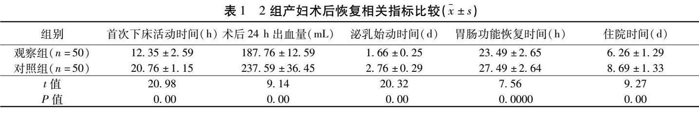 摘要 目的:探讨快速康复护理模式对剖宫产术产妇的临床效果及对其睡眠质量的影响。方法:选取2019年2月至2021年3月南华大学附属第二医院收治的剖宫产术产妇100例作为研究对象,随机分为对照组和观察组,每组50例。对照组采用常规护理模式完成护理干预,观察组在对照组护理基础上采用快速康复护理模式完成护理干预;比较2组产妇术后恢复指标(首次下床活动时间、术后24 h出血量、泌乳始动时间、胃肠功能恢复时间、住院时间)、尿潴留发生率、焦虑自评量表(SAS)评分、抑郁自评量表(SDS)评分、睡眠效率、入睡时间、睡眠时间以及匹兹堡睡眠质量指数量表(PSQI)评分。(剩余6990字)
