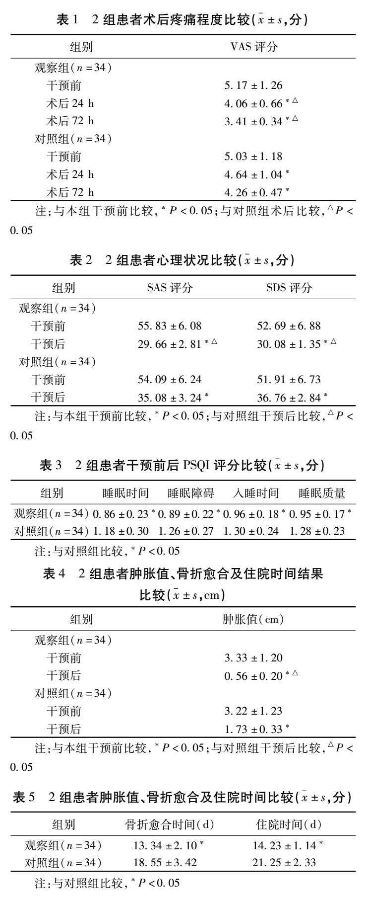 摘要 目的:观察急诊创伤性骨折患者疼痛护理干预的效果及对睡眠质量的影响。方法:选取2021年6月至2022年6月南安市南侨医院急诊科收治的急诊创伤性骨折患者68例作为研究对象,按照病历收集时间,根据信封法分为2组。对照组给予基础护理干预,观察组给予疼痛护理干预。采用匹兹堡睡眠质量指数(PSQI)比较2组患者睡眠质量的差异,采用焦虑自评量表(SAS)、抑郁自评量表(SDS)比较2组患者焦虑、抑郁症状改善情况,采用视觉模拟评分法(VAS)比较2组患者的疼痛感受,同时比较2组患者肿胀值、骨折愈合及住院时间。(剩余5817字)