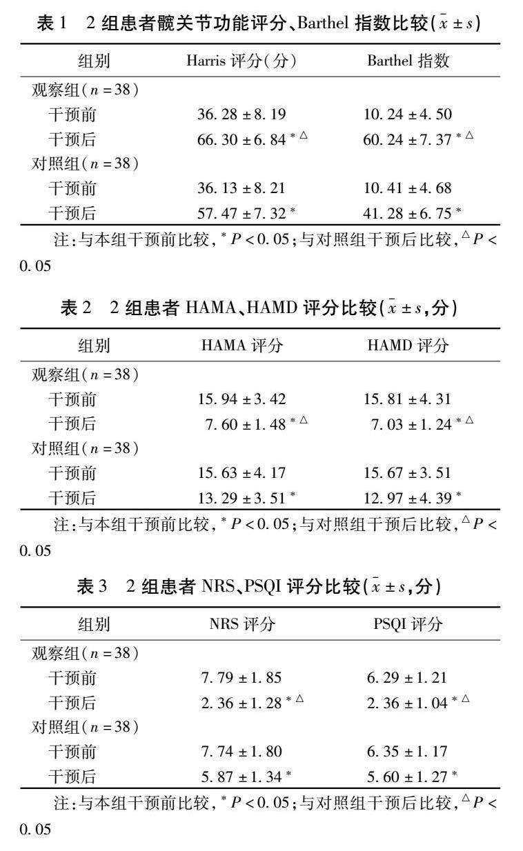 摘要 目的:分析多维度强化护理干预对髋部骨折术后患者疼痛及睡眠的影响。方法:选取2019年9月至2022年9月山东省邹城市人民医院收治的髋部骨折手术治疗患者76例作为研究对象,按照随机数字表法分为观察组和对照组,每组38例。对照组给予常规护理干预,观察组给予多维度强化护理干预。采用匹兹堡睡眠质量指数(PSQI)比较2组患者睡眠质量变化,采用Harris量表评估组间髋关节功能恢复情况,采用Barthel指数评估患者的生活能力恢复情况,采用汉密尔顿焦虑量表(HAMA)、汉密尔顿抑郁量表(HAMD)比较2组患者干预前后焦虑、抑郁的改善情况,采用疼痛数字量表(NRS)比较2组患者的疼痛改善效果。(剩余6244字)