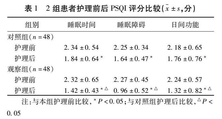 摘要 目的:探讨与分析针对性护理提高精神分裂症患者的治疗效果及改善睡眠质量的效果。方法:选取2020年5月至2022年4月泉州市第三医院收治的精神分裂症患者96例作为研究对象,按照抽签法随机分为对照组和观察组,每组48例。对照组采用常规护理措施,观察组患者采用针对性护理措施,比较2组患者护理前后的睡眠质量、心理状况,以及生命质量。(剩余6369字)