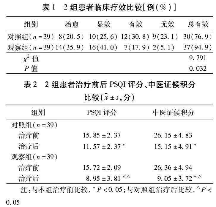 摘要 目的:观察火龙罐疗法治疗心脾两虚型失眠的临床疗效。方法:选取2020年7月1日至2021年7月31日在广东省中山市中医院治未病中心、睡眠专科及中医护理门诊就诊的心脾两虚型失眠患者78例,采用随机数字表法分为观察组和对照组,每组39例。对照组采用归脾汤加减治疗,观察组采用火龙罐疗法联合归脾汤加减治疗,2组患者均连续治疗1个月。(剩余8106字)