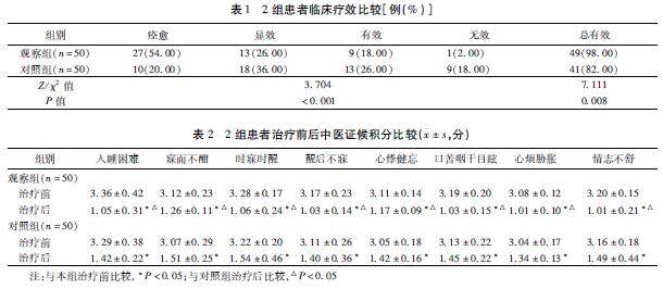 摘要 目的:观察柴桂龙牡汤联合阿普唑仑治疗失眠伴焦虑抑郁障碍的临床疗效。方法:选取2023年3月至2024年12月山东省聊城市第四人民医院诊治的失眠伴焦虑抑郁障碍者100例作为研究对象,根据用药方案分为对照组和观察组,每组50例。对照组给予阿普唑仑治疗,观察组给予柴桂龙牡汤联合阿普唑仑治疗。比较2组疗效,观察中医证候、焦虑与抑郁及睡眠障碍状况变化。(剩余7490字)