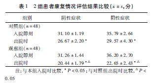 摘要 目的:为改善与优化精神分裂症住院患者康复情况、认知功能及睡眠质量,拟通过对照试验验证引入关爱帮扶综合干预是否利于其疾病康复与回归社会。方法:选取2021年6月至2024年6月青岛优抚医院精神一科收治的精神分裂症住院患者96例作为研究对象,按照随机数字表法随机分为对照组和观察组,每组48例。对照组采用常规护理方案,观察组采用关爱帮扶综合干预方案,通过2组康复情况评估结果、认知功能改善程度、睡眠质量优化结果等数据的量化与比较性,统计验证2种护理方案的优劣。(剩余7059字)
