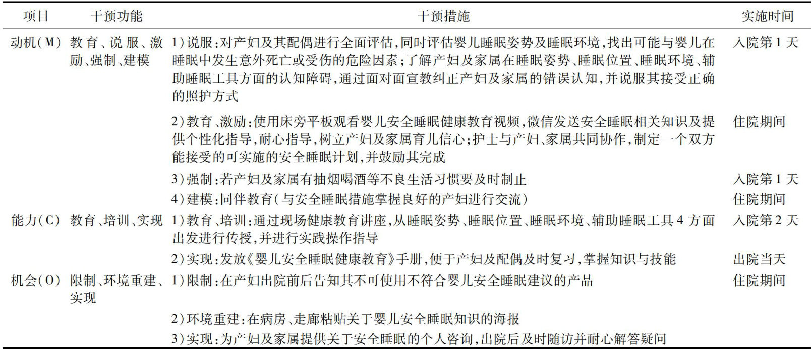 AbstractObjective:To investigate theefectsof health educationbasedonthe Behavior Change Wheel(BCW)theoryonthe safetysleepknowledge,parentingconfidenceandparentingbehaviorof parentsof infants.Methods:Atotalof132postpartum womenandtheirspouseswhodeliveredatYiwu Maternaland ChildHealth Hospitalfrom October2023 toOctober 2O24 wereselected as study subjects. They were divided into a control group and an observation group( n=66 each)according to maternal admissioorder.Thecontrol groupreceivedroutinehealtheducation,whiletheobservation groupreceivedBCWtheory-basedhealth educationinaddition toroutinecareDiferences insafesleepknowledge mastery,parentingconfidencelevels,andparentingbehaviorswerecomparedbetweenthetwogroups.Results:Aftertheinterventio,thesafetysleepknowledgelevelsoftheparentsin both groups improved. The safety sleep knowledge score of the observation group( 28.18±4.17 )was higher than that of the control group(2 ?5.32±4.88 ),and the diffrence was statistically significant.The parenting confidence of the parents in the observation groupimproved,whilethetotalscoreandscores ofeachdimensionofparentingconfidenceinthecontrolgroupshowednosignificantdiferencecompared withthosebeforetheintervention.Moreover,theparentingconfidencescoreandscoresofeachdimension in the observation group( 31.14±9.17 ) were higher than those in the control group(27.74 ±7. 45),and the difference was statistically significant( P<0.05 ). The proportion of children in the observation group who slept in their parents'room and in thesupine positionwas higherthanthatinthecontrolgroup.Conclusion:BCWtheory-basedhealth educationefectively enhances infant parents'masteryof safe sleep knowledge,strengthens parenting confidence,and improves parenting behaviors.