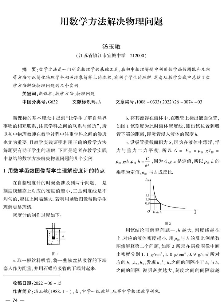 摘要:数学方法是一门研究物理学的基础工具,在初中物理解题中利用数学函数图像和几何等方法可以简化物理学科相关现象解释上的流程,有利于学生的理解.笔者从教学实践中总结了数学方法解决物理问题的几个实例.