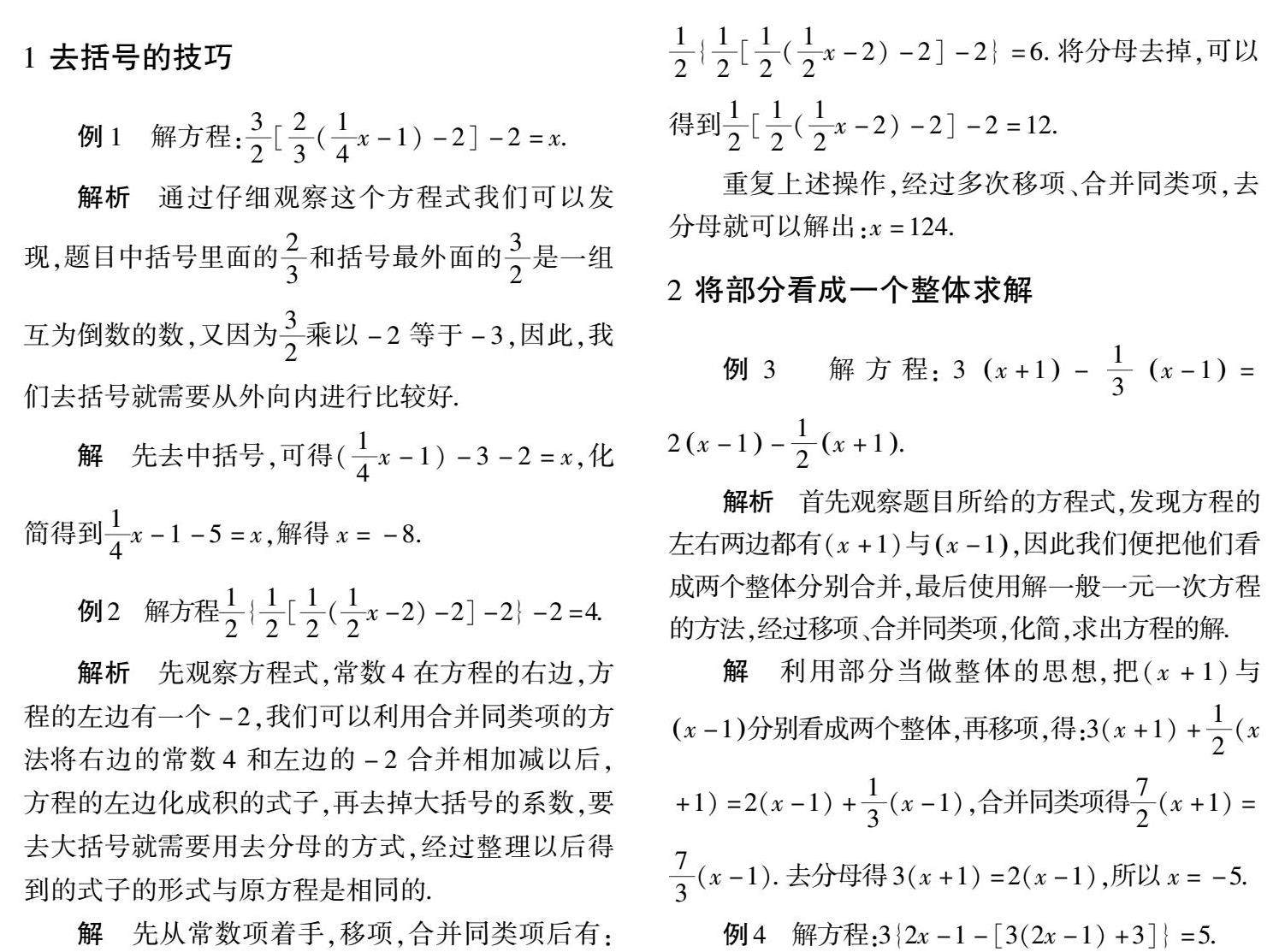 摘 要:一般来说,解答一元一次方程的大概步骤主要包括:去分母、去括号、移项、合并同类项,再把未知数的系数化为1.然而,这个适用于大部分一元一次方程的方法,也有它不能解决的问题.对形式特殊的一元一次方程,就要先找到方程的特殊结构,再选取合适的方法进行求解.解题过程简单,不仅可以提高解题速度,还能拓宽思(剩余355字)
