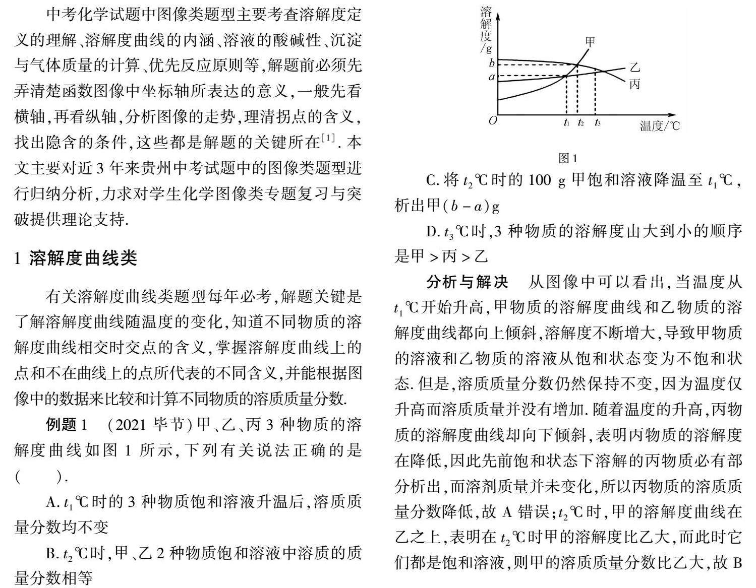 摘 要:近年来中考化学试题中以函数图像为载体的图像类试题越来越多,难度也有加大趋势,它要求学生从直观的图像中去挖掘化学反应的相关信息,有助于学生观察能力和分析能力的培养,为今后学生学习复杂的化学理论知识夯实基础.