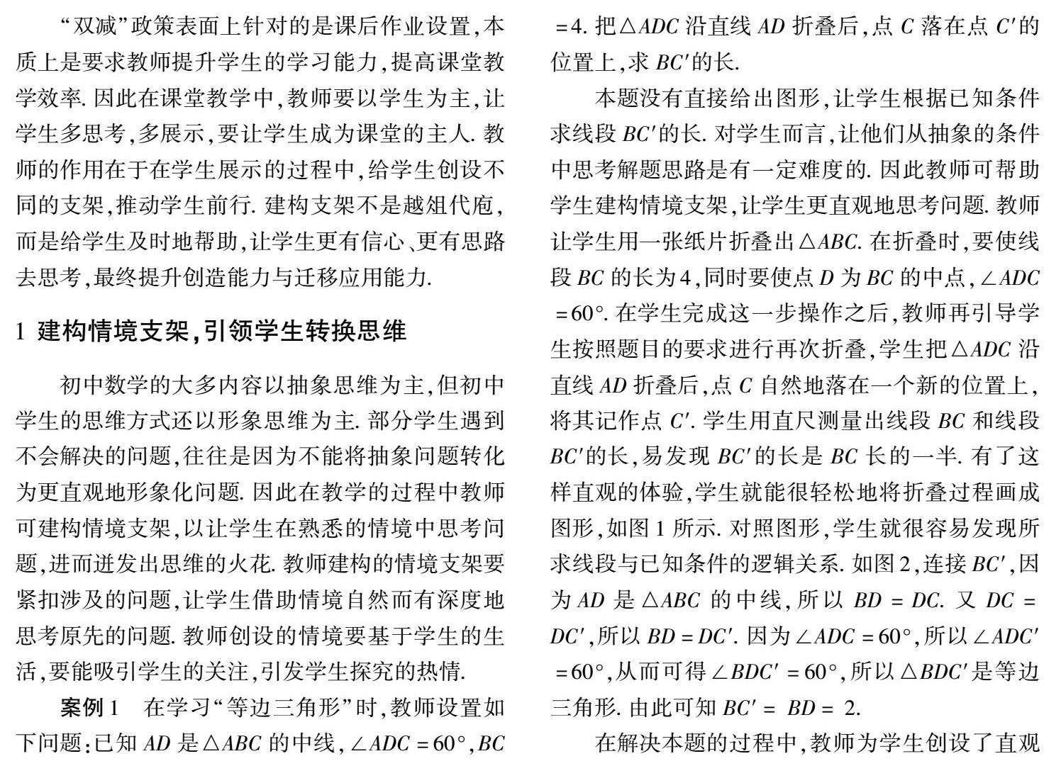 摘 要:在初中数学教学的过程中教师要遵循“双减”政策,切实减轻学生的作业负担,促进学生的身心发展.其实要真正落实“双减”政策,教师不仅要减少学生作业的量,同时要提升课堂的质量.学生只有在课上多学了,在课后的负担才能真正地减少.教师在课堂巧设支架,能促进学生思维的发展,提升学习效率,进而在课堂上发展他(剩余1686字)
