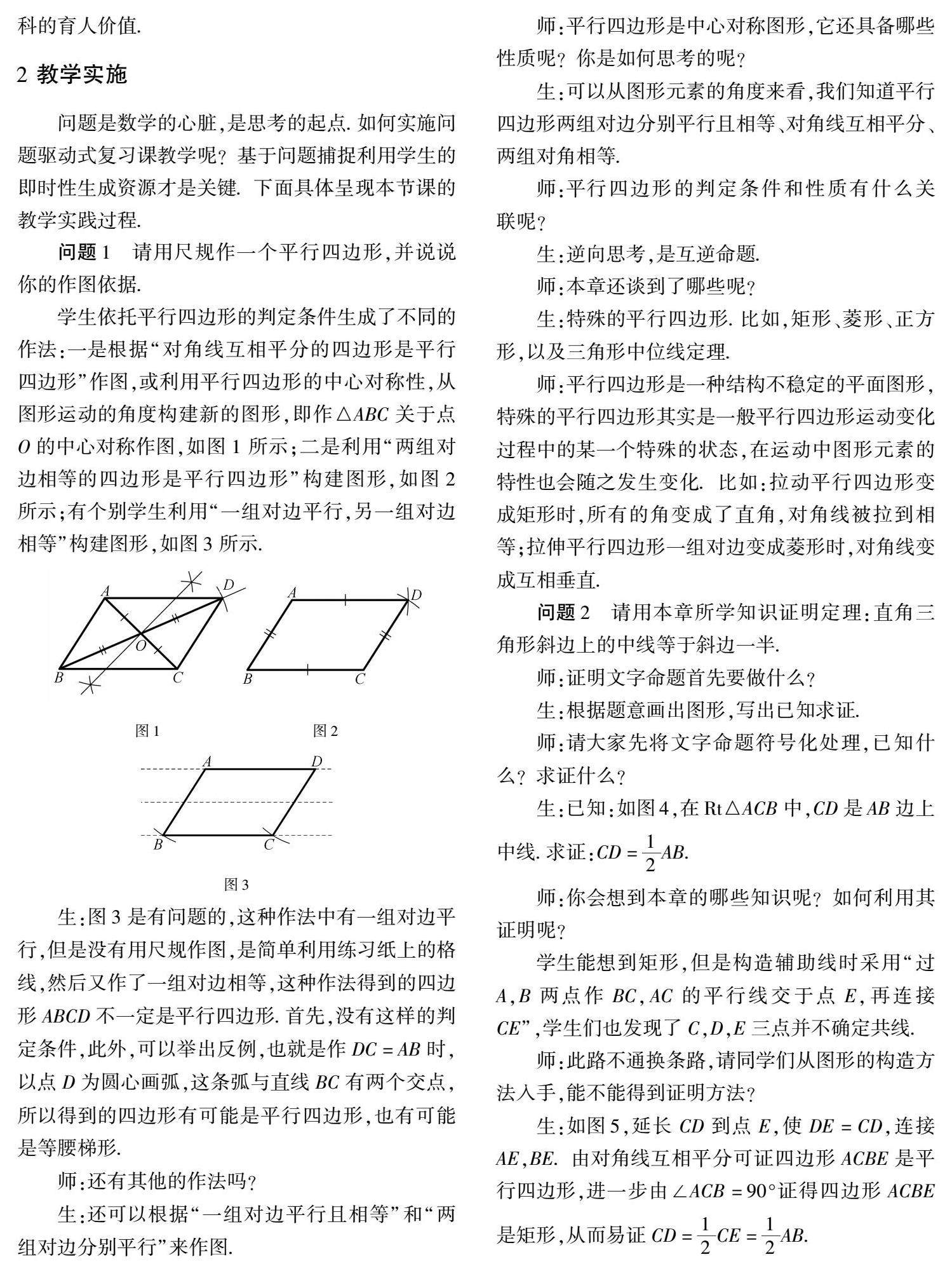 摘 要:复习课是数学课堂教学的重要课型,“如何创新复习课教学”也一直是热点问题.在数学学科育人理念的指引下,文章以《中心对称图形——平行四边形》单元复习课为例设计和实施教学,探索“问题驱动式”教学模式在初中数学复习课教学中的实践研究,以期提升学生核心素养,发挥数学学科育人价值.
