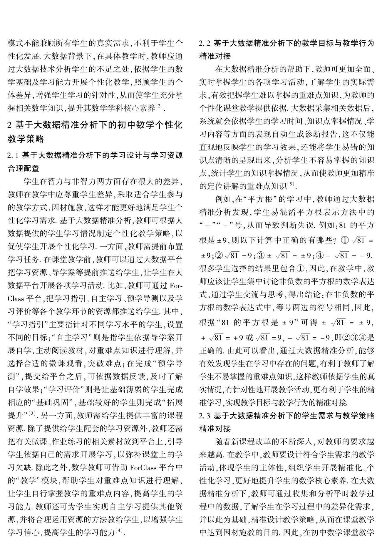 摘 要:基于大数据精准分析下的初中数学个性化教学模式改变了传统的数学教学模式,通过大数据对学生的学习数据和行为进行持续跟踪记录,能够发现学生在学习中存在的问题,了解学生的学习状况,从而准确把握学情,并以此为依据开展个性化教学.