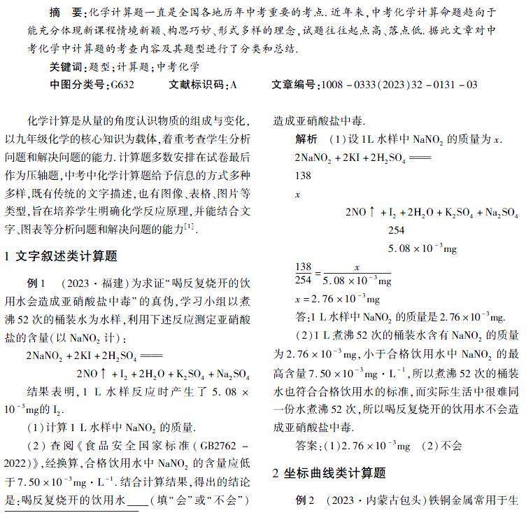 摘要:化学计算题一直是全国各地历年中考重要的考点.近年来,中考化学计算命题趋向于能充分体现新课程情境新颖、构思巧妙、形式多样的理念,试题往往起点高、落点低.据此文章对中考化学中计算题的考查内容及其题型进行了分类和总结.