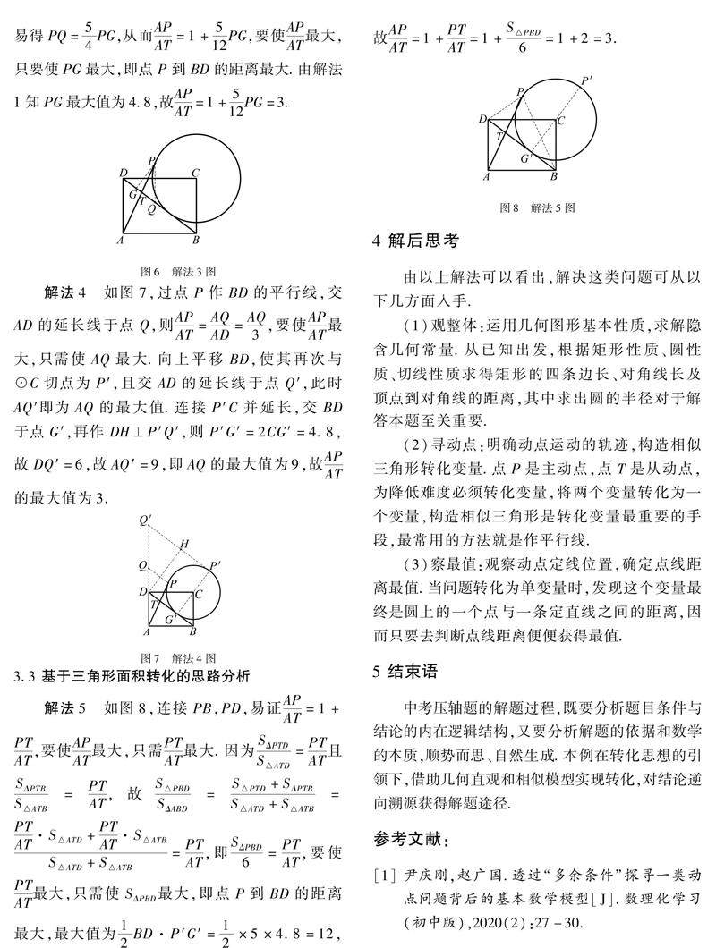 摘 要:2019年连云港市中考数学第16题是一道探求两条动线段之比的最大值问题,动点P在圆周上运动,无法直接入手利用距离的最值解决问题,可考虑运用转化化归的数学思想,将两个变量转为“一定一动”即单变量问题,然后利用相似或面积法转化目标线段的比值,从而简化问题,得到问题解决的基本路径,并提炼一般性模型(剩余2953字)