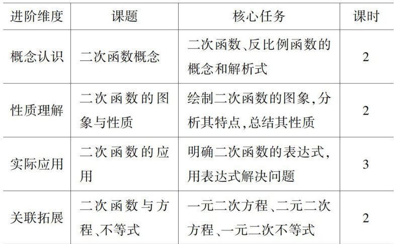 进阶维度又称为进阶变量,主要指向与核心概念相关的内容,能够充分反映学生对核心概念的理解程度.学生的思维发展过程不是一蹴而就的,是通过一个个子概念的学习而逐步建立起来的.在初中数学学习过程中,学生通过搜集资料、专项训练、知识探究等方法攻克教学难点和重点问题,掌握子概念的相关内容,再将子概念结合起来,形成完整的核心概念,最终实现思维进阶发展.由此可以推断,学生学习二次函数的过程也需要经过多维度的进阶发展,后一个维度的学习在前一个维度的基础上进行.“二次函数”单元知识的学习指向四个进阶维度,即概念认识、性质理解、实际应用、关联拓展.其中,概念认识的教学重点是建立基本的感知系统,对单元内的知识进行初步扫描;性质理解的教学重点是分析和应用,与二次函数图象性质相对应;实际应用的教学重点是实践操作,学生利用所学知识解决真实的问题;关联拓展的教学重点是创新、内化和迁移,学生要理解方程和不等式的用法2.起点是学生当前所处的位置,即思维发展的现状,终点是学生经过单元学习后要达到的结果,起点和终点之间的层级便是进阶维度.高阶思维能力是学生在感知、分析的基础上开展实践和应用的能力,是发生在较高认知水平层次上的心智活动或认知能力,它在教学目标分类中表现为分析、综合、评价和创造