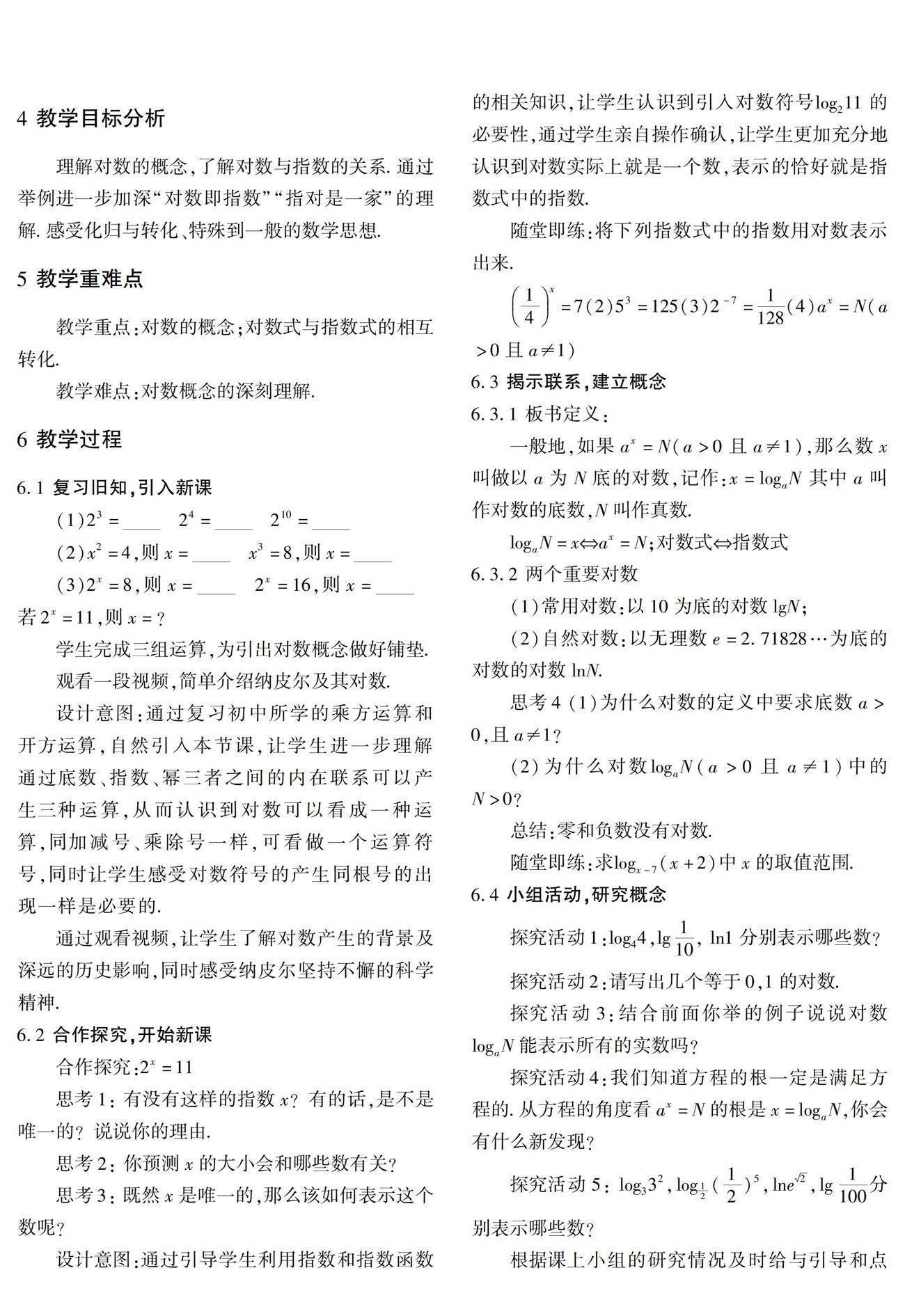 摘 要:《对数的概念》是对数函数的起始课,对数函数是一类非常重要的基本初等函数,在数学和其他领域都有重要的应用.本节课的学习是指数函数的自然延续,笔者采用步步设问、分组探究的教学方式,通过让学生讲题的方法,引导学生发现知识的形成过程,通过“对数即指数,指对是一家”的口诀来加深对对数概念的理解,从而为(剩余1809字)