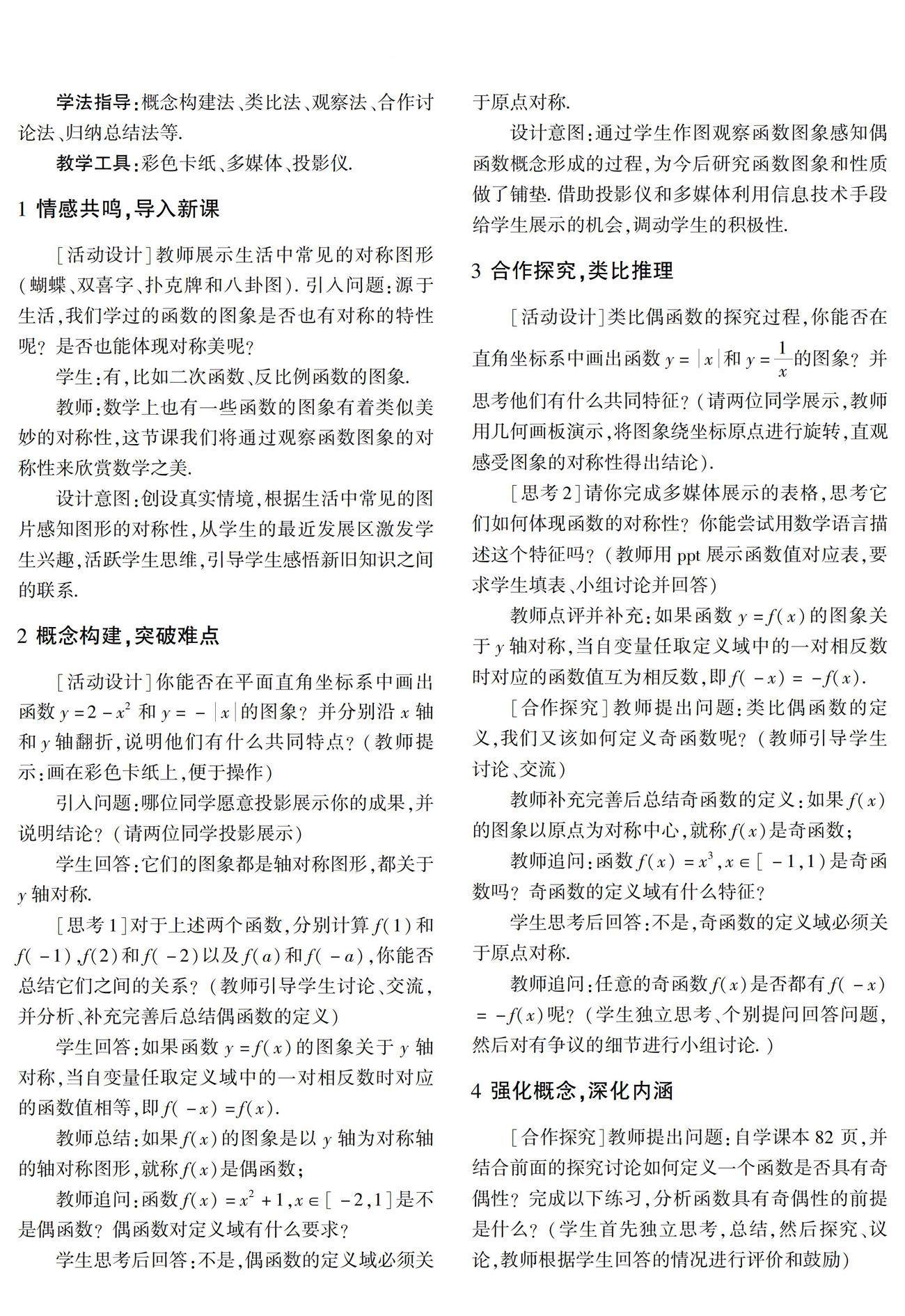 摘 要:为了将数学核心素养落实到高中数学课程中,本文以《函数的奇偶性》教学为例进行探究,采用概念构建、自主学习、合作讨论、问题链设置等教学策略,借助多媒体信息技术整合教学,指导高中数学课堂教学实践,培养学生的数学思维和科学探究能力,以适应新高考政策下对全面提高学生数学核心素养的教学需求.