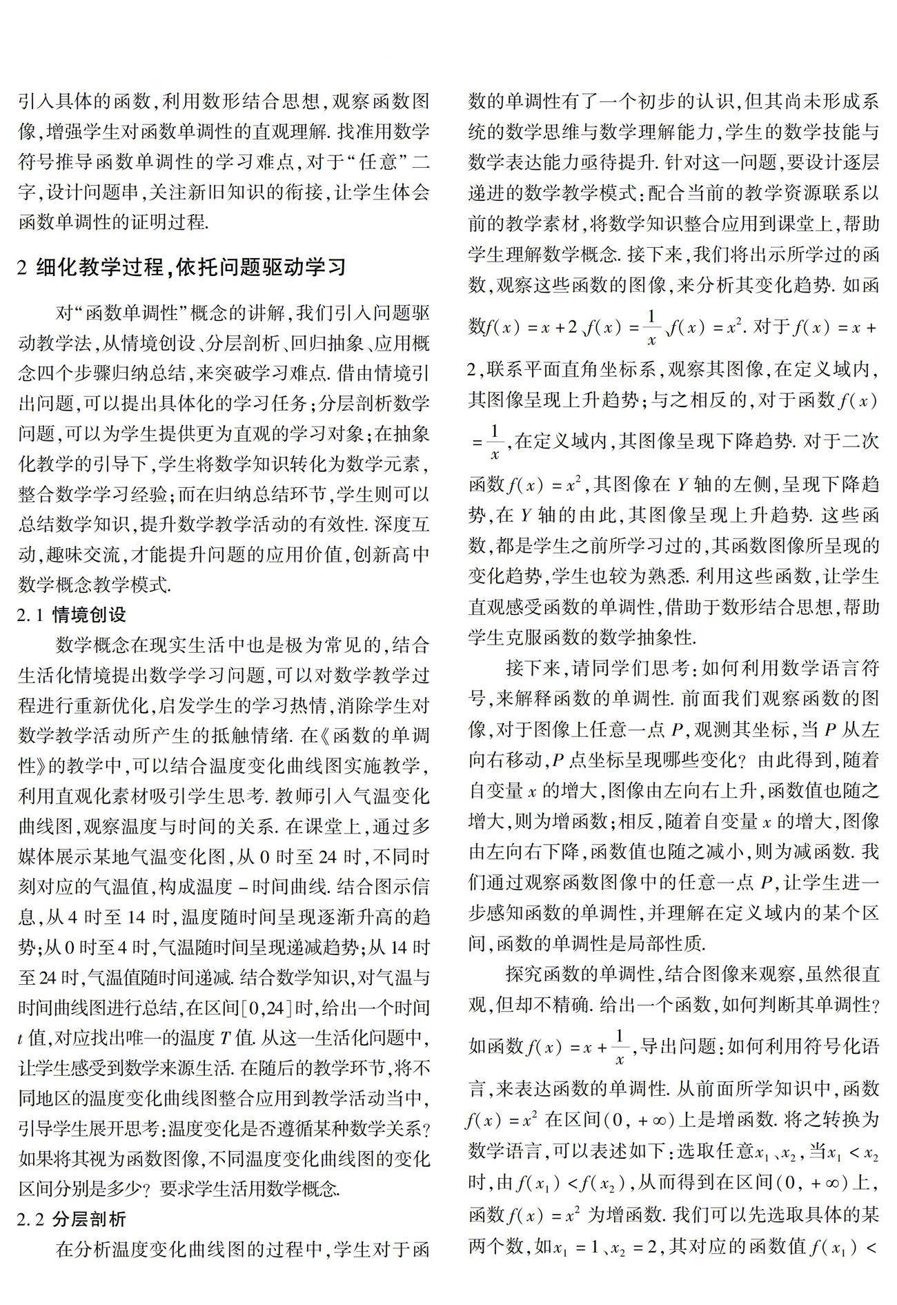 摘 要:数学概念具有抽象性,也是学生理解的难点.高中阶段,对数学概念的讲解,往往借助于问题驱动模式,通过问题来进行概念学习,帮助学生深刻认识、掌握数学概念的内涵.问题是导线,通过创设恰当的问题情境,剖析概念要点,探究概念的抽象本质,深化学生对概念的理解,促进学生数学思维的迁移和内化.