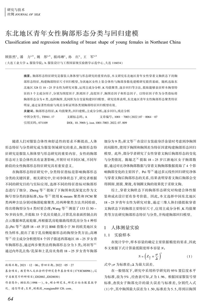 摘要: 胸部形态特征研究是服装人体体型与形态研究的重要内容,本文研究东北地区青年女性穿着文胸状态下的胸部形态特征,构建胸部特征尺寸回归模型,为该地区女性上装合体性与胸部参数化建模研究提供基础。随机选取东北地区328位18~25岁女性为研究对象,运用主成分分析、K均值聚类、逐步回归等方法,提取能够表征样本胸型特征的5个主成分因子,分别为围度因子、距离因子、高度因子、胸围差因子和形态因子。(剩余12356字)