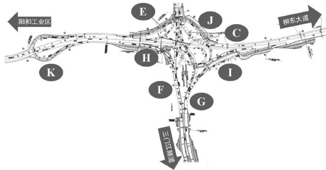 原三门江立交为单喇叭立交,既有匝道有C、D、E、Q匝道。需将此单喇叭立交改造为全互通立交。改建方案新建F、G、H、I、J、K六个匝道,并对局部位置加宽改造(图1)。