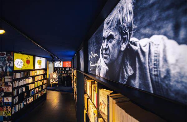 2023年7月12日,位于捷克布尔诺的米兰·昆德拉图书馆悬挂起昆德拉肖像照。