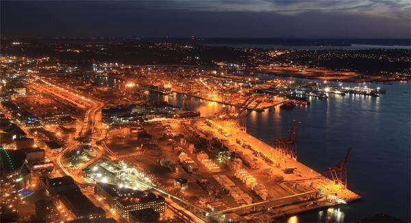 夜幕中的美国第二大集装箱港西雅图港。1979年4月18日,上海远洋运输公司的“柳林海”货轮在此停靠,成为1949年以来首艘靠挂美国港口的悬挂中华人民共和国国旗船舶。