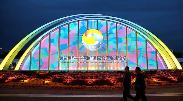 2023年10月18日,第三届“一带一路”国际合作高峰论坛开幕式在北京举行。图为国家会议中心前论坛主题景观。