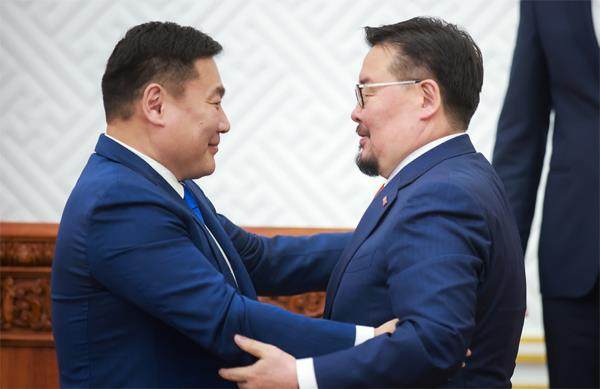 2025年6月13日,蒙古国家大呼拉尔(议会)全体会议决定任命赞丹沙塔尔(右)为新一任总理。6月3日,议会未通过有关总理信任投票决议草案,奥云额尔登(左)被视为辞职。