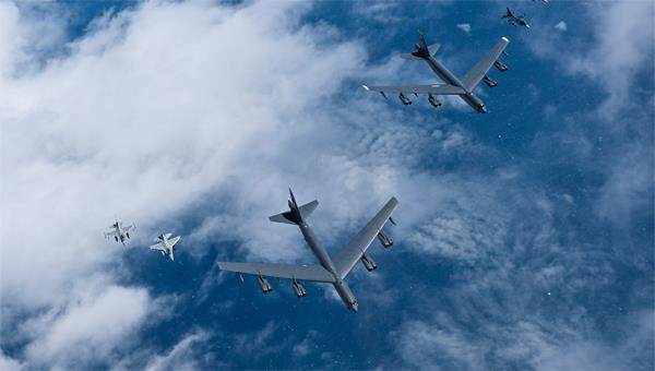 2025年7月11日,日美韩在韩国济州岛南部公海上空举行联合空中演习,美战略轰炸机B-52H参与。