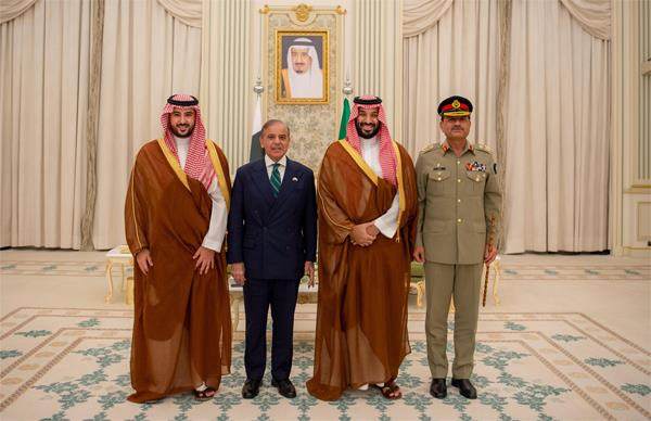 2025年9月17日,巴基斯坦总理夏巴兹(中左)在与沙特王储兼首相穆罕默德(中右)签署完共同战略防御协议后合影。