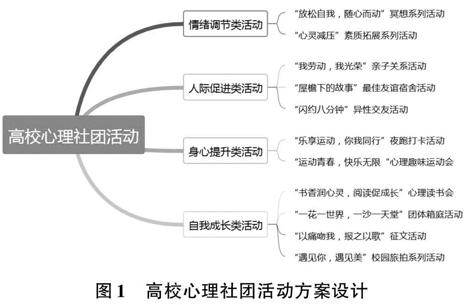 摘 要:为探究突发公共卫生事件背景下高校心理社团活动方案的相关问题,对2332名大学生开展了问卷调查,根据问卷调查结果及相关文献梳理,将高校心理社团活动方案设计为情绪调节类、人际促进类、身心提升类、自我成长类四种类型,并分别进行了阐述。