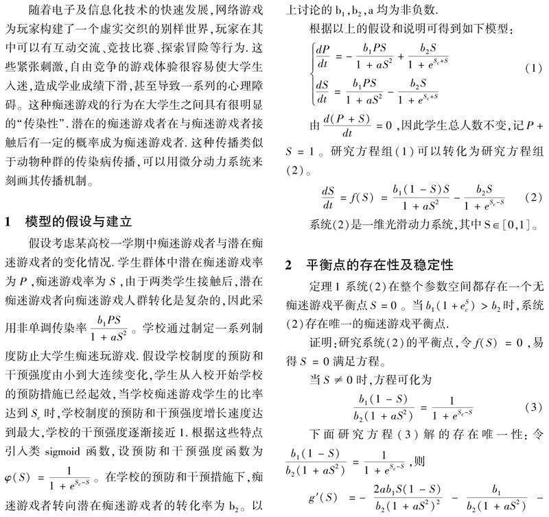 摘 要:引入学校干预机制建立带有非单调传染率的大学生戒网络游戏模型.研究了系统平衡点的存在性和稳定性,发现参数b1,b2,b3跨过临界值时,系统平衡点的稳定性发生改变,系统发生跨临界分岔.最后,应用Dulac判断证明了系统不存在周期轨道.