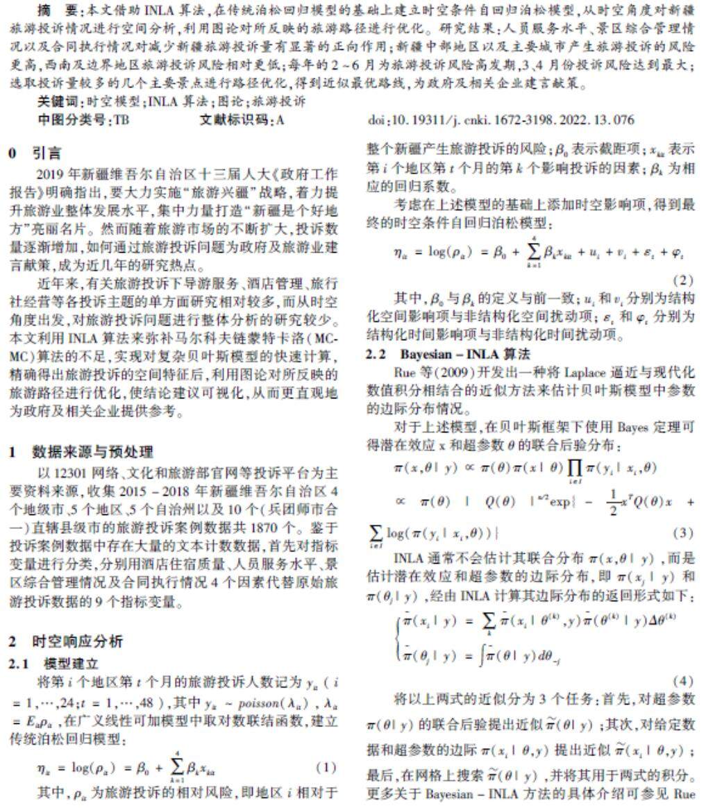 摘要:本文借助INLA算法,在传统泊松回归模型的基础上建立时空条件自回归泊松模型,从时空角度对新疆旅游投诉情况进行空间分析,利用图论对所反映的旅游路径进行优化。研究结果:人员服务水平、景区综合管理情况以及合同执行情况对减少新疆旅游投诉量有显著的正向作用;新疆中部地区以及主要城市产生旅游投诉的风险更高,西南及边界地区旅游投诉风险相对更低;每年的2~6月为旅游投诉风险高发期,3、4月份投诉风险达到最大;选取投诉量较多的几个主要景点进行路径优化,得到近似最优路线,为政府及相关企业建言献策。(剩余4179字)