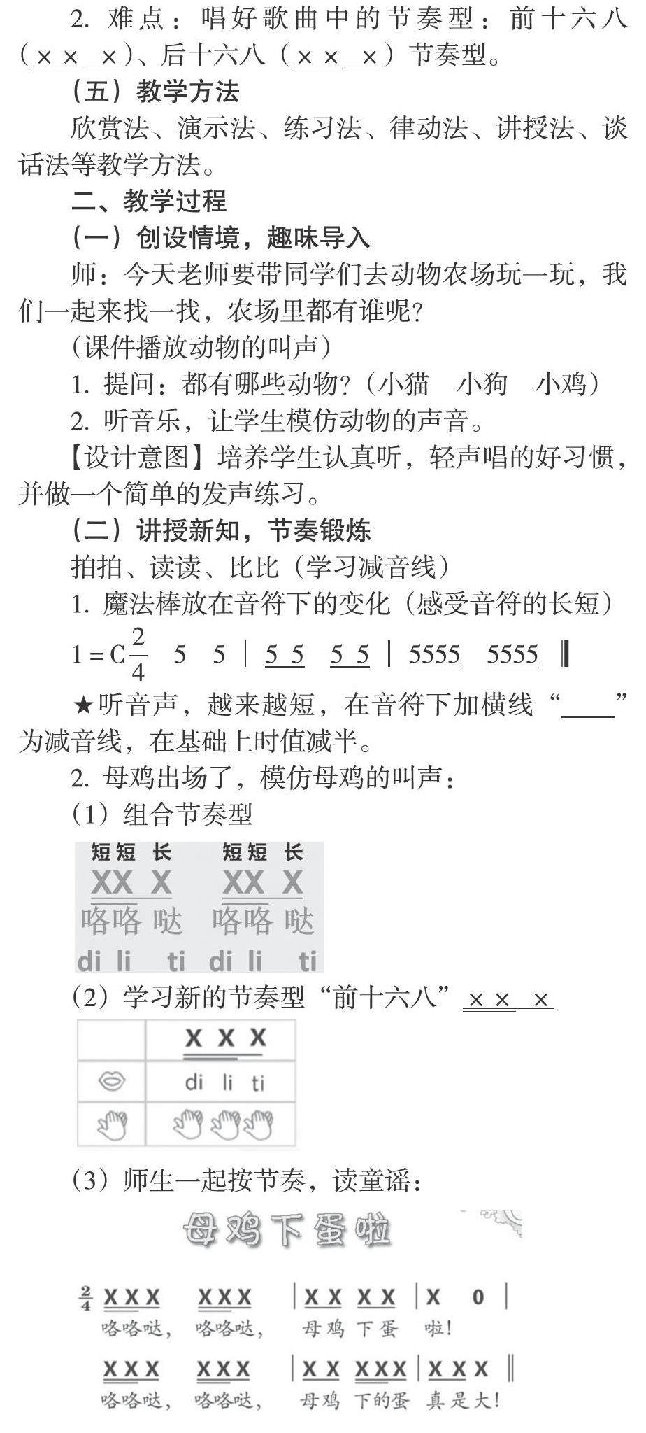 在原来学习的“× -、×、× ×、××××、× ××”五种节奏的基础上,本课再次新增加一个“×× ×”节奏的学习,至此,本套教材已经学习了六种基本节奏。(剩余2976字)