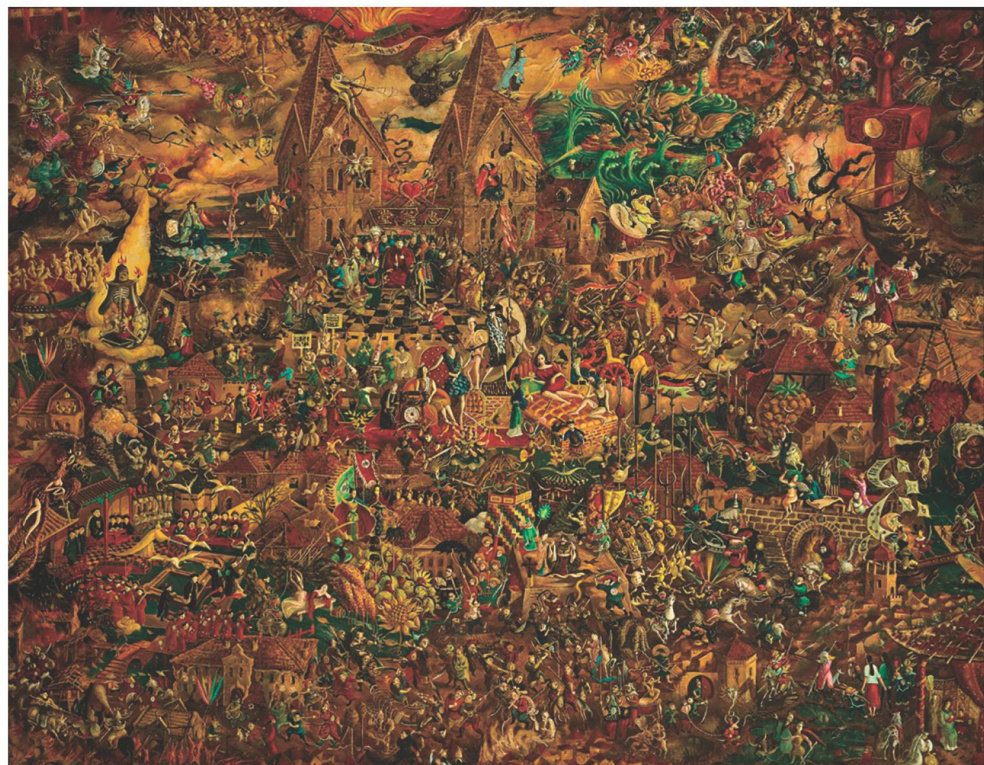 【主持人语】1989年,画家刘大鸿以《惊蛰》为题创作了一幅油画作品。该画将古今中外各种因素融为一体,以密不透风的构图与造型,描绘了世间万象与人生百态。原本毫不相干的许多人和事,如古罗马的教堂、传统中国的园林、西方武士、中国文人,以及当代社会的饮食男女等等,都被刘大鸿撮合在一个画面,形成了一个极为荒诞的视觉景观,仿如梦境,又如魔界,让人眼花缭乱的同时,不由得浮想联翩。(剩余145字)