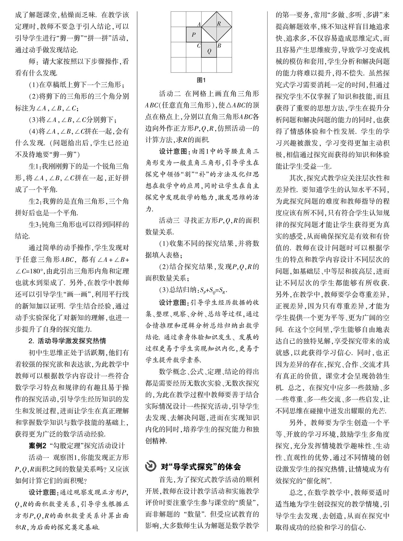 [摘 要] 在传统数学教学中,教师过多地强调解题方法和技巧,过分注重结论而忽视了知识的发生和发展过程,使得学生在学习时表现得过于被动和消极. 而“导学式探究”教学模式在激发学生创新精神、培养学生自学能力等方面具有独特的作用,为此教师可以依据实际情况适时引入,引导学生多经历一些探究过程,进(剩余3163字)