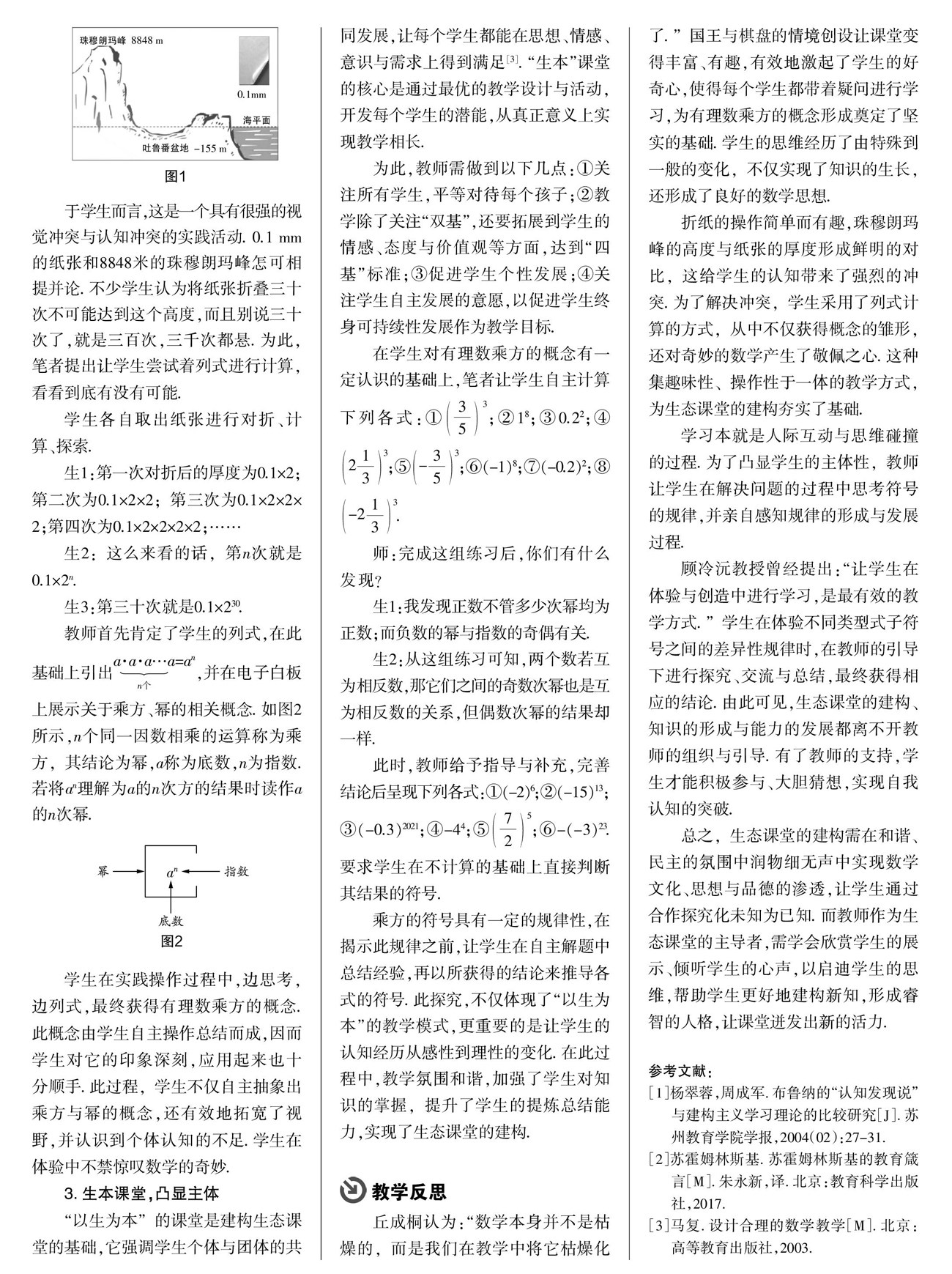 [摘 要] “生态”二字顾名思义,就是绿色、健康、优质的意思. 课堂是教育教学的重要载体,对学生各项能力的形成与发展具有深远的影响. 生态课堂是教育发展的必然产物,是一种顺应人性自然发展的教育模式. 文章以“有理数乘方”的教学为例,具体从情境课堂,激趣探究;体验课堂,启发思维;生本课堂,(剩余3288字)