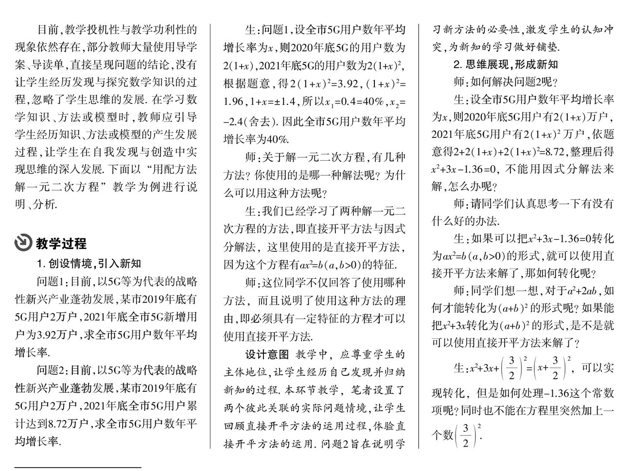[摘 要] 文章“用配方法解一元二次方程”教学为例,提出促进学生思维不断发展的教学路径,即创设情境,引入新知;思维展现,形成新知;师生互动,掌握方法;思维升级,逐步转化. 让学生从质疑开始,在类比中感悟,在联想中领悟,促进学生的思维向深处不断漫溯.