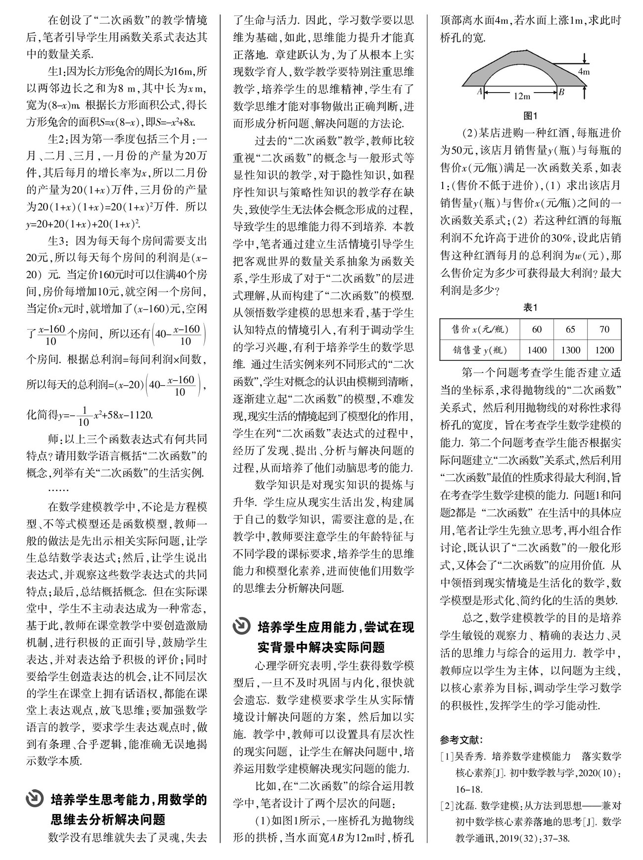 [摘 要] 文章以“二次函数”教学为例,提出初中数学建模素养的培养路径,即培养学生的观察能力,用数学的眼光审视世界;培养学生的表达能力,用数学的语言表达数学问题;培养学生的思考能力,用数学的思维去分析解决问题;培养学生的应用能力,尝试在现实背景中解决实际问题.