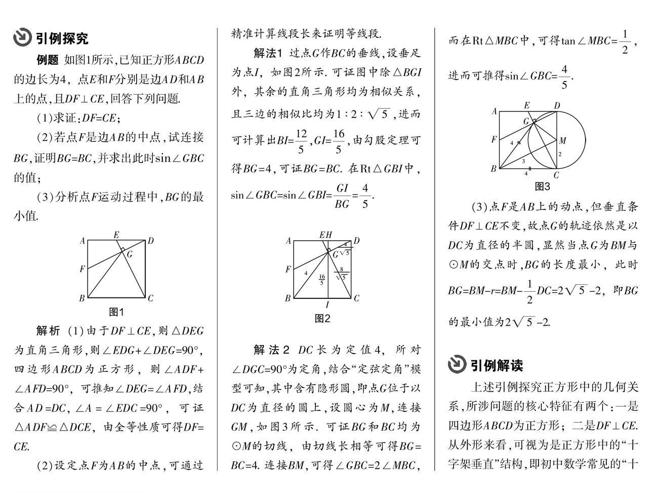 [摘 要] 正方形及矩形中的“十字架垂直”模型在数学几何中十分常见,虽然模型结构简单,但其转化策略及模型结论有着广泛的应用. 文章将对一道引例加以分析并提炼解读模型,结合实例拓展应用,提出相应的教学建议,与读者交流.