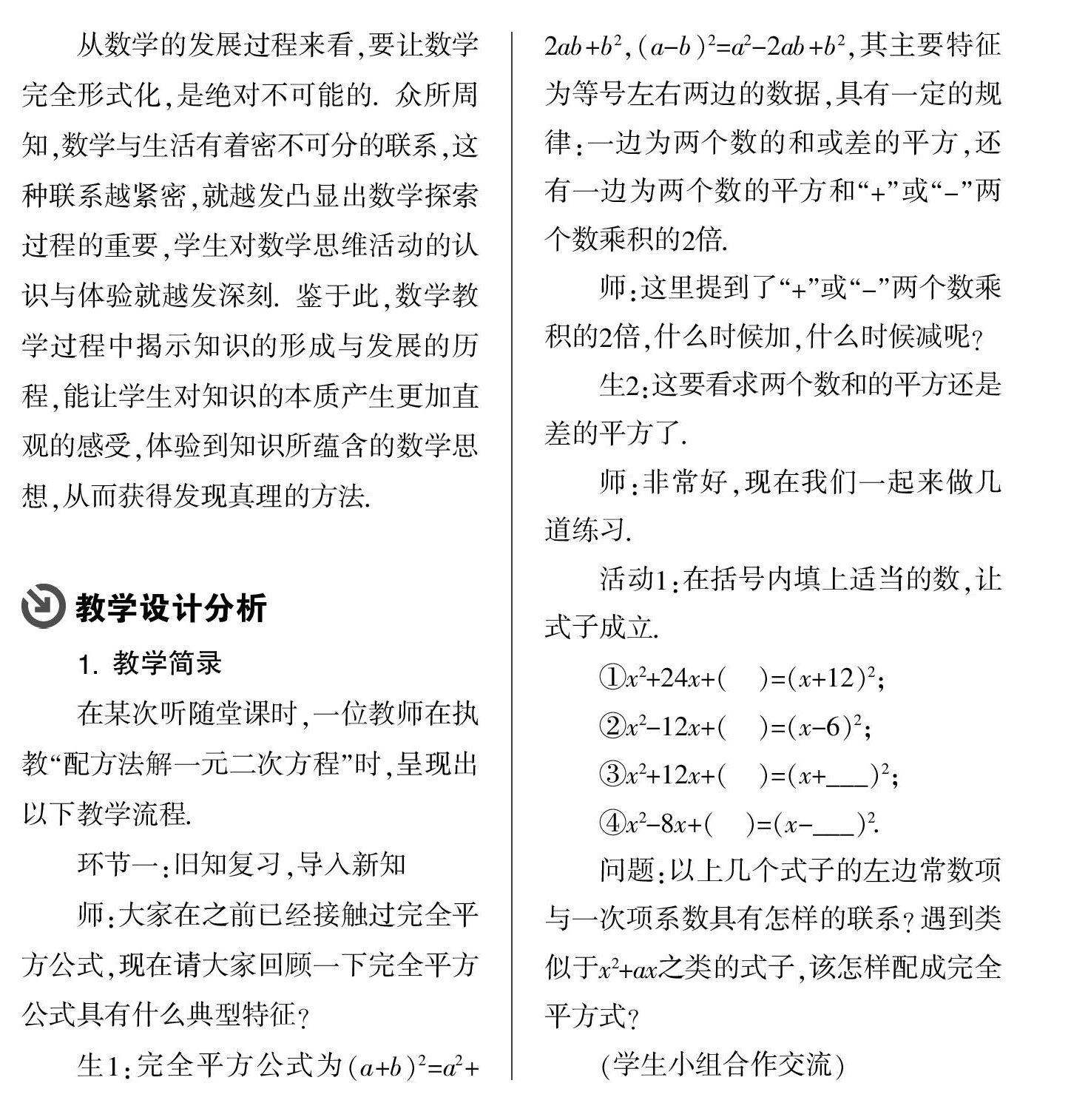 [摘 要] 随着新课改的推进,各种教学方式的探索开展得如火如荼,但不论教学形式发生怎样的变化,教学的基本原则——注重数学本质的揭示,永远不会发生改变. 揭露本质是一切教学设计的基本思想,是数学教学的立足之本. 文章以“配方法解一元二次方程”的教学设计为例,对如何揭露数学本质,谈一些具体的(剩余5278字)