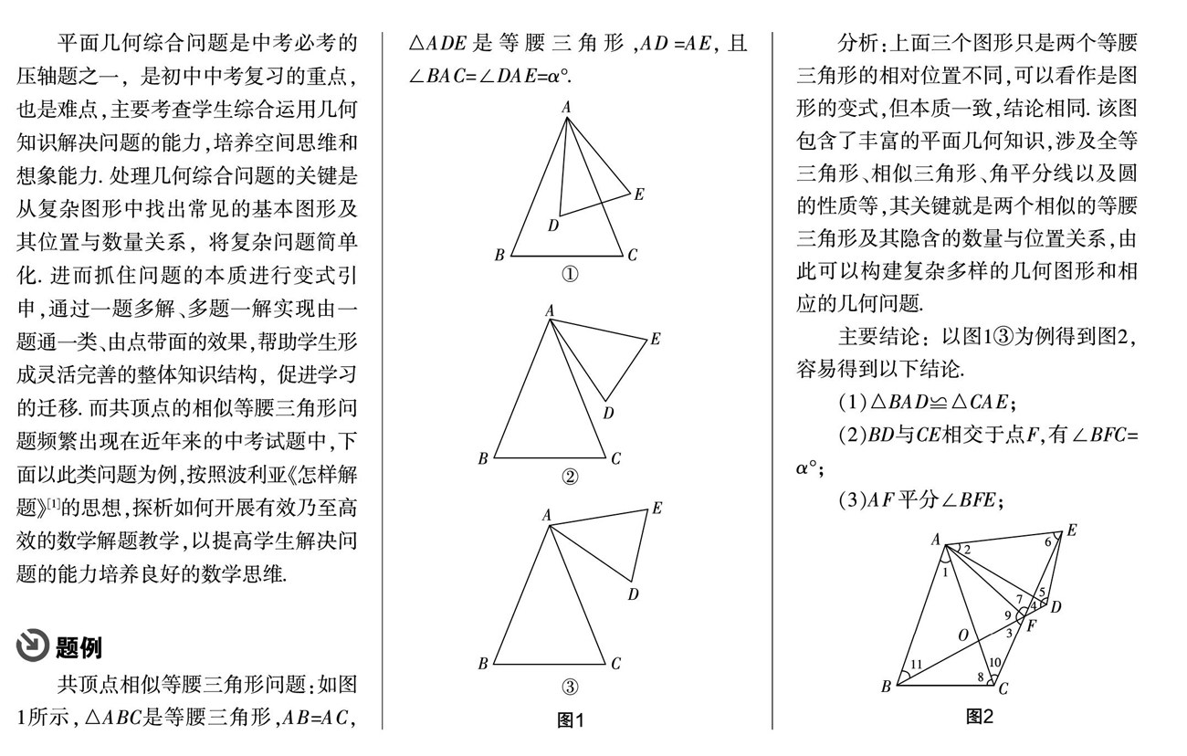 [摘 要] 几何是培养学生空间思维和想象能力的重要载体,也是中考的重要考点. 处理几何综合问题的关键是从复杂图形中找出常见的基本图形及其位置与数量关系,将复杂问题简单化,从而找到解决问题的思路和方法. 研究以共顶点相似三角形问题为例,探讨几何解题教学的路径与策略.
