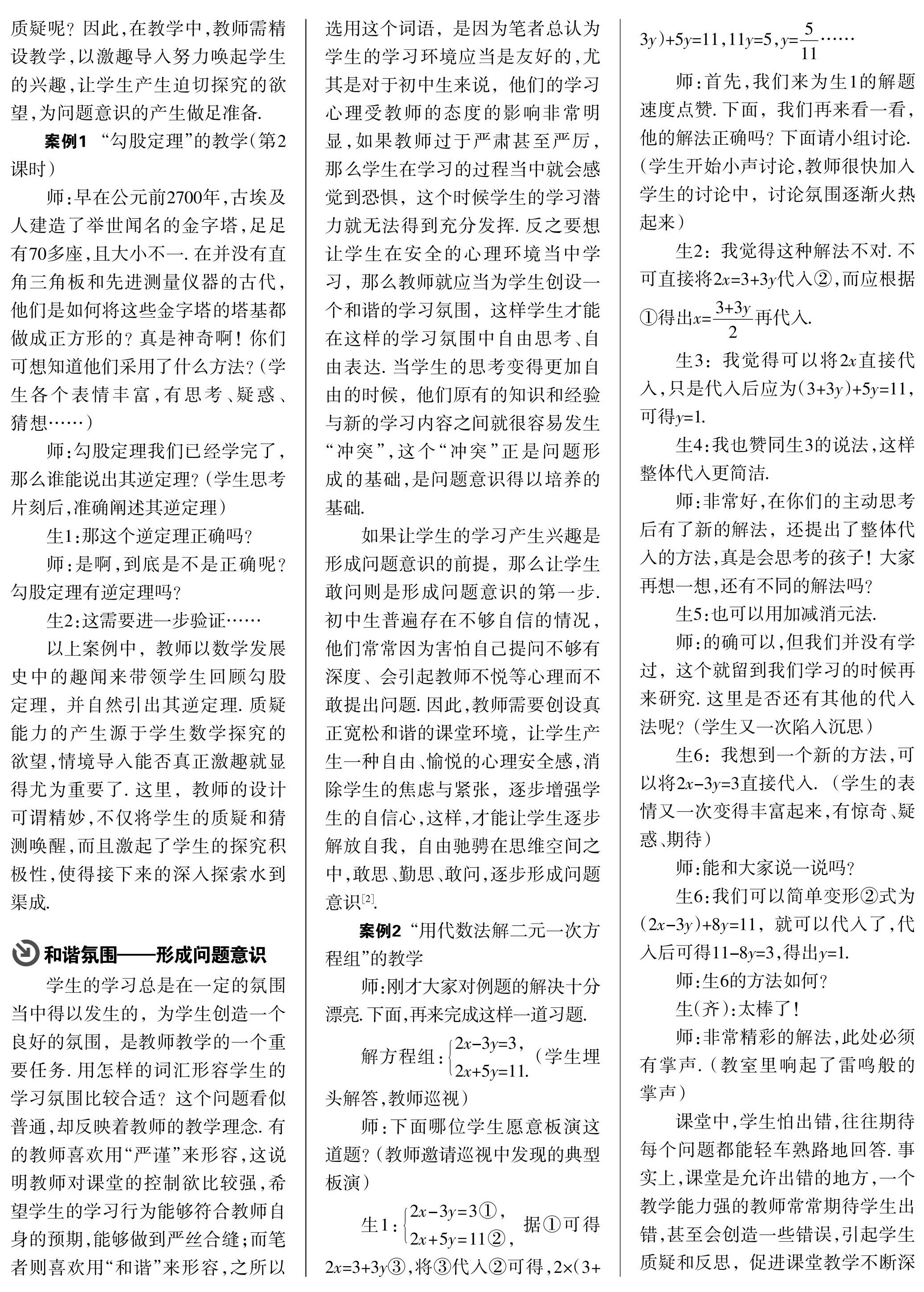 [摘 要] 问题意识是伴随着思维活动而产生的,由于这种认知体验并非原生态的,因而需要教师在教学中有意识地加以训练. 对此,教师可以通过激趣导入、营造和谐氛围和引导合作学习等方式一以贯之地培养学生,让学生经历发现、探索和讨论的过程,通过课堂学习,学会质疑、善于质疑,孕育创新能力.