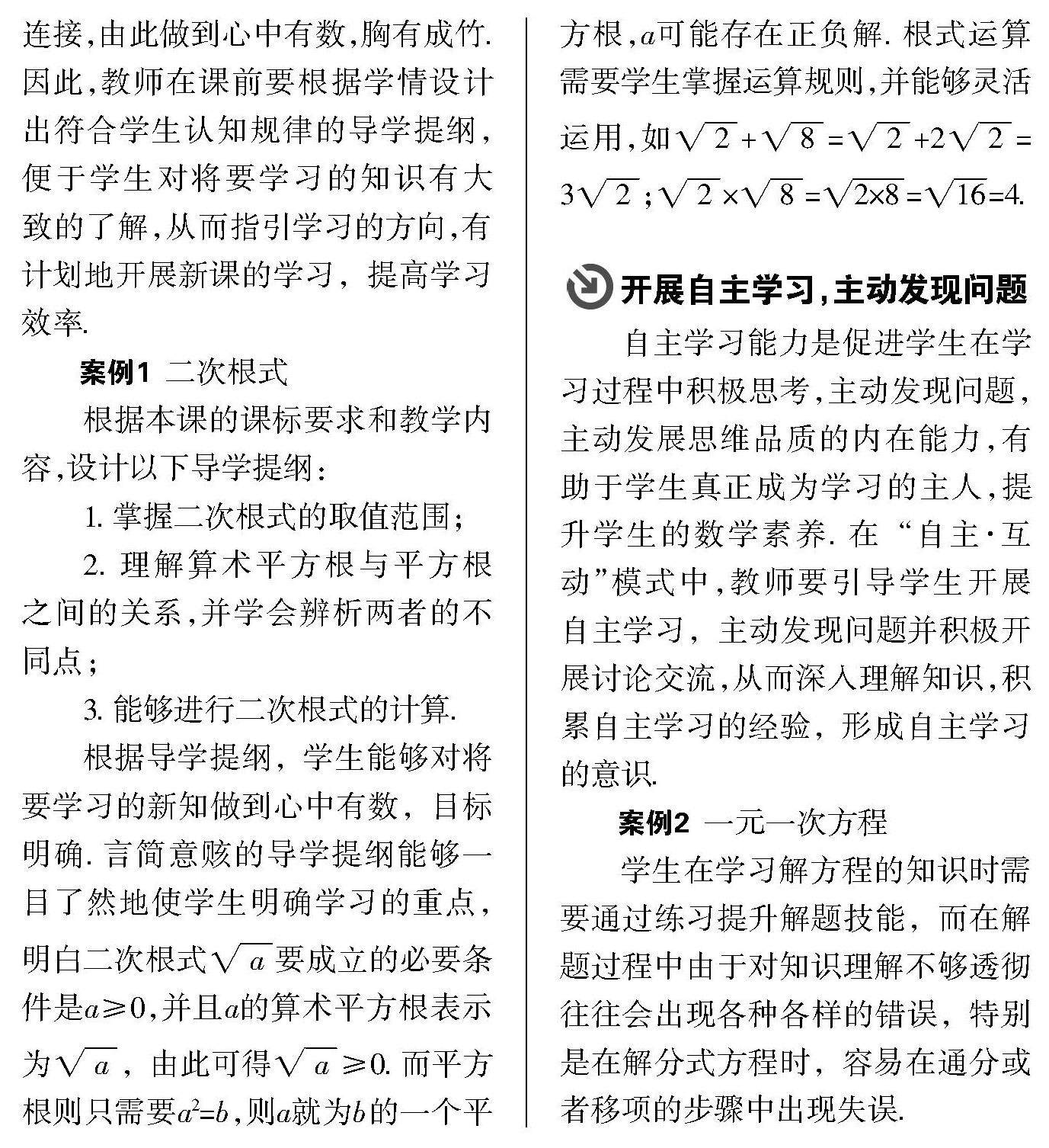 [摘 要] 应用“自主·互动”教学模式是指教师引领学生在课前了解学习方向,进而引导学生开展自主学习与小组合作,在师生互动交流中实现课堂思维的交流和碰撞,并在总结归纳中提升思维认(剩余3039字)