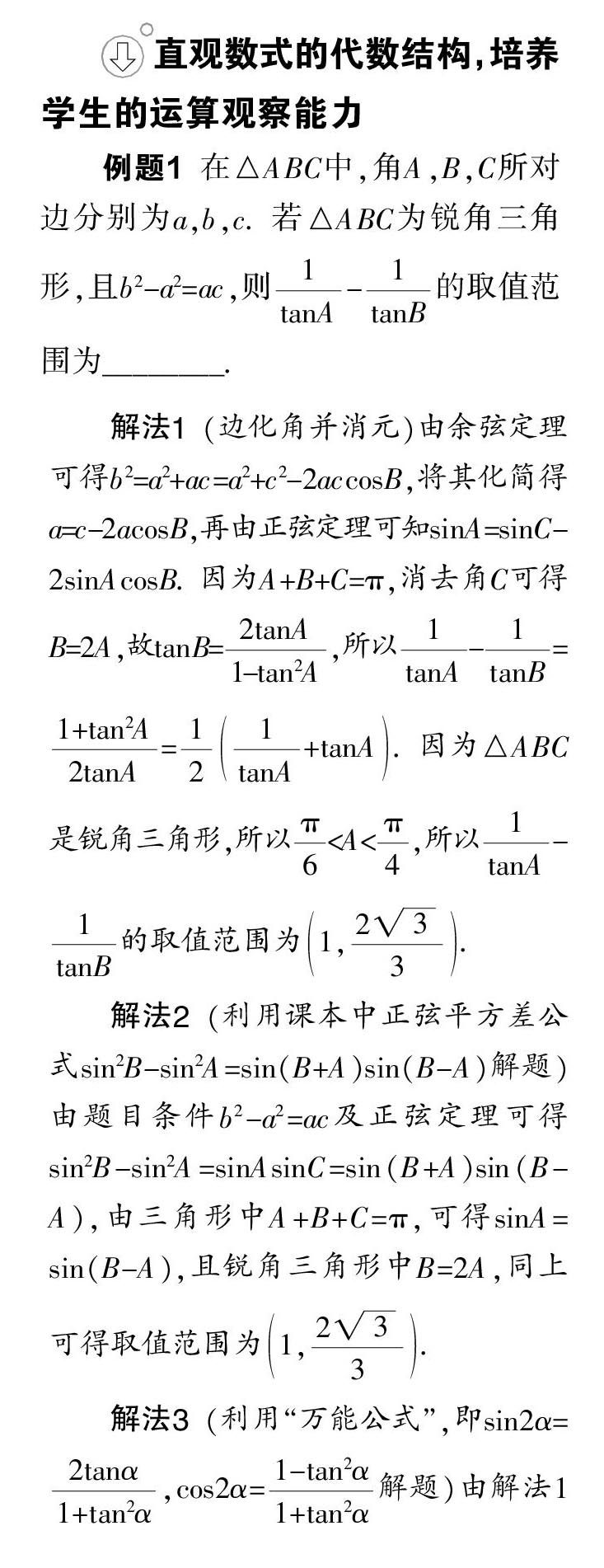 [摘 要] 众所周知,数学运算能力是指在明晰运算对象的基础上,依据运算法则解决数学问题的素养. 因此,文章从高三一轮复习中一节常态课的例题入手,通过对数学对象的代数结构、几何结构的观察、分析,让学生掌握转化与化归、数形结合等重要的数学思想方法,提升高三学生的数学解题运算能力,渗透数学核心(剩余3899字)