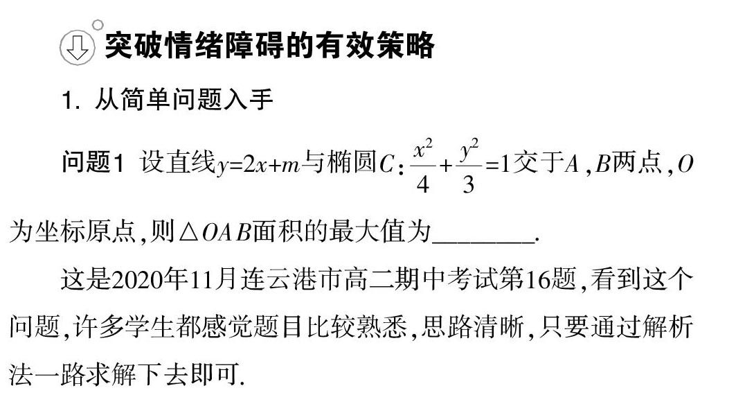 [摘 要] 在求解解析几何问题时,由于运算烦琐,学生易产生情绪障碍. 用数学的思维方式,从简单问题入手,把问题一般化,探索通性通法,优化解题路径,回归教学原点,把握数学本质等教学策略,对于突破学生情绪障碍有启发性,在教学中也具有可操作性.