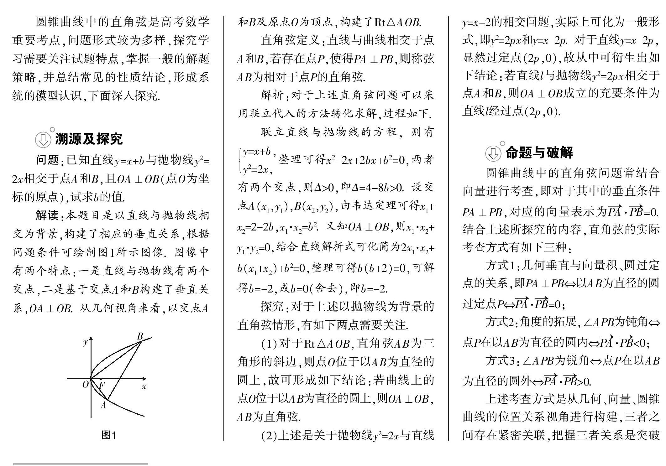 [摘 要] 直角弦是基于曲线与直线位置所构建的特殊弦,实则为直角三角形的斜边,故具有直角三角形的特性. 由于具有圆锥曲线的背景,直角弦模型含有特殊的性质结论,以其为基础的考题较为常见,关注模型特征与命题方式极为重要. 文章对此类问题模型进行溯源,并结合实例探讨突破策略.