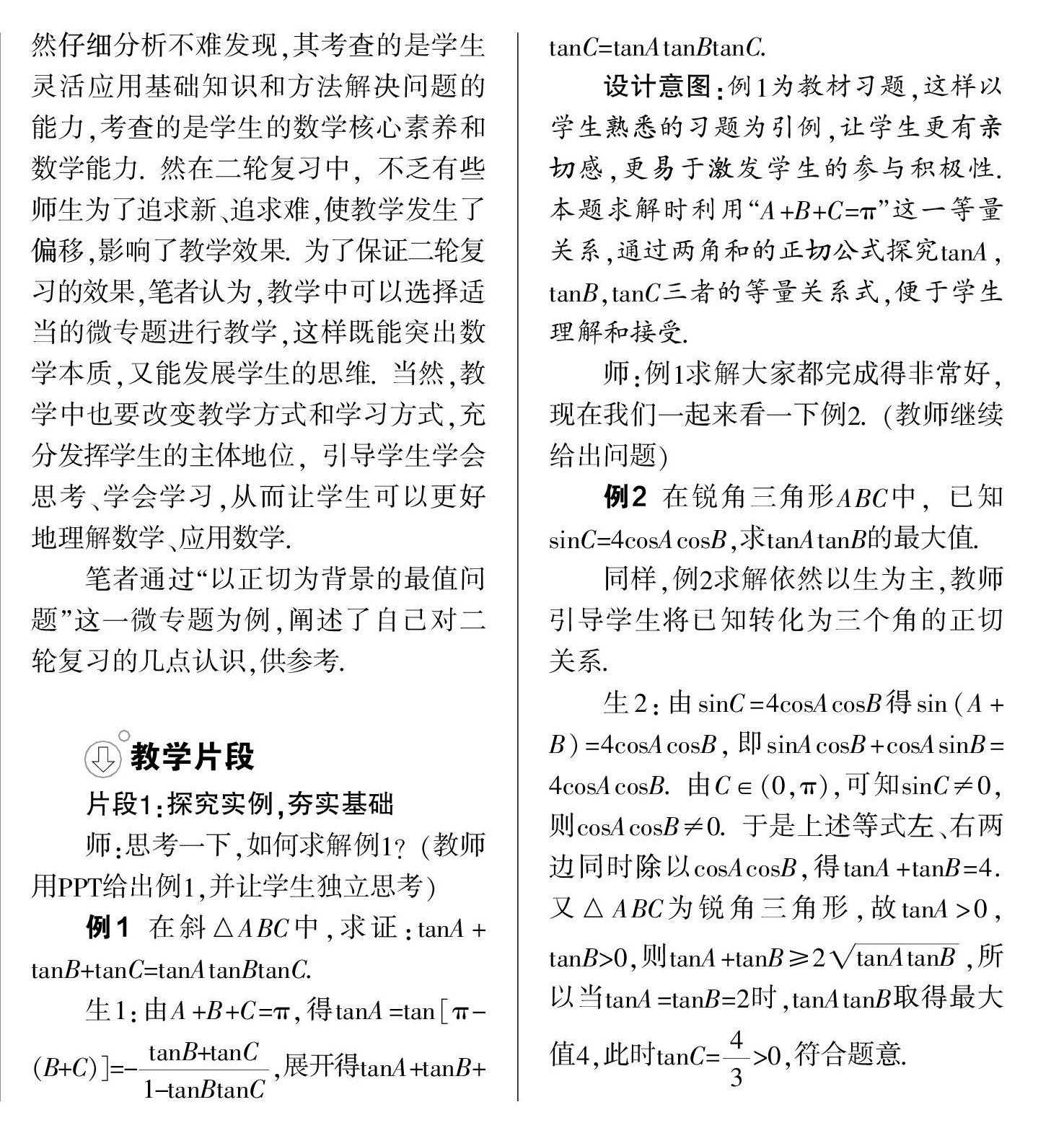 [摘 要] 在高三二轮复习时,教师可以选择一些切口小、思路宽的微专题进行复习,这样既能有效避免简单重复所带来的枯燥感,帮助学生跳出“题海”,又能通过有针对性、有目的性的引导诱发数学思考,让学生掌握解决问题的基本思想方法,挖掘数学本质,以此提升学生提出问题、分析问题和解决问题的能力.