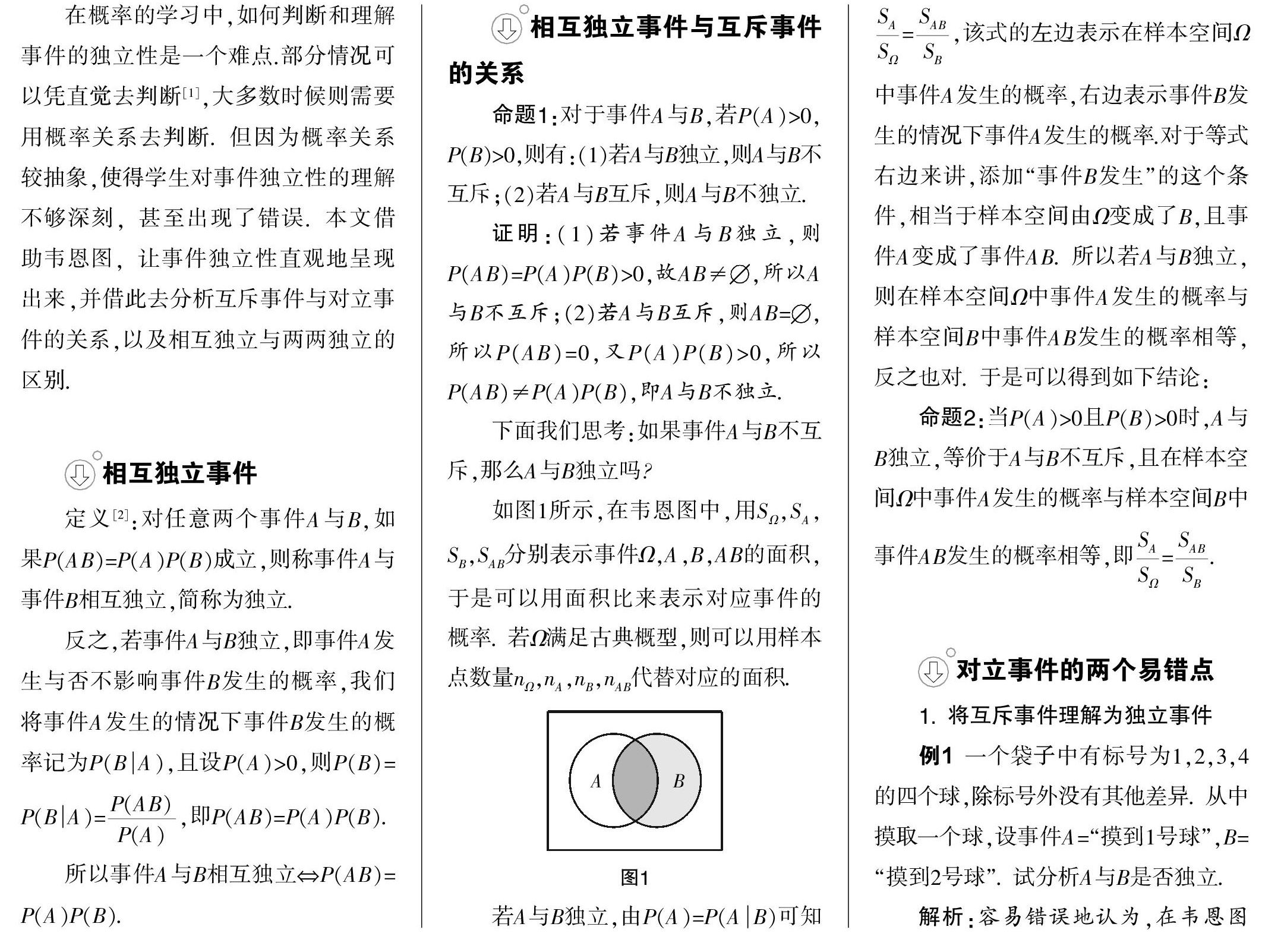 [摘 要] 事件的独立性是一个相对抽象的概念,文章借助韦恩图直观分析事件独立性的本质,并进一步分析互斥事件与独立事件的关系,以及两两独立与相互独立的区别.