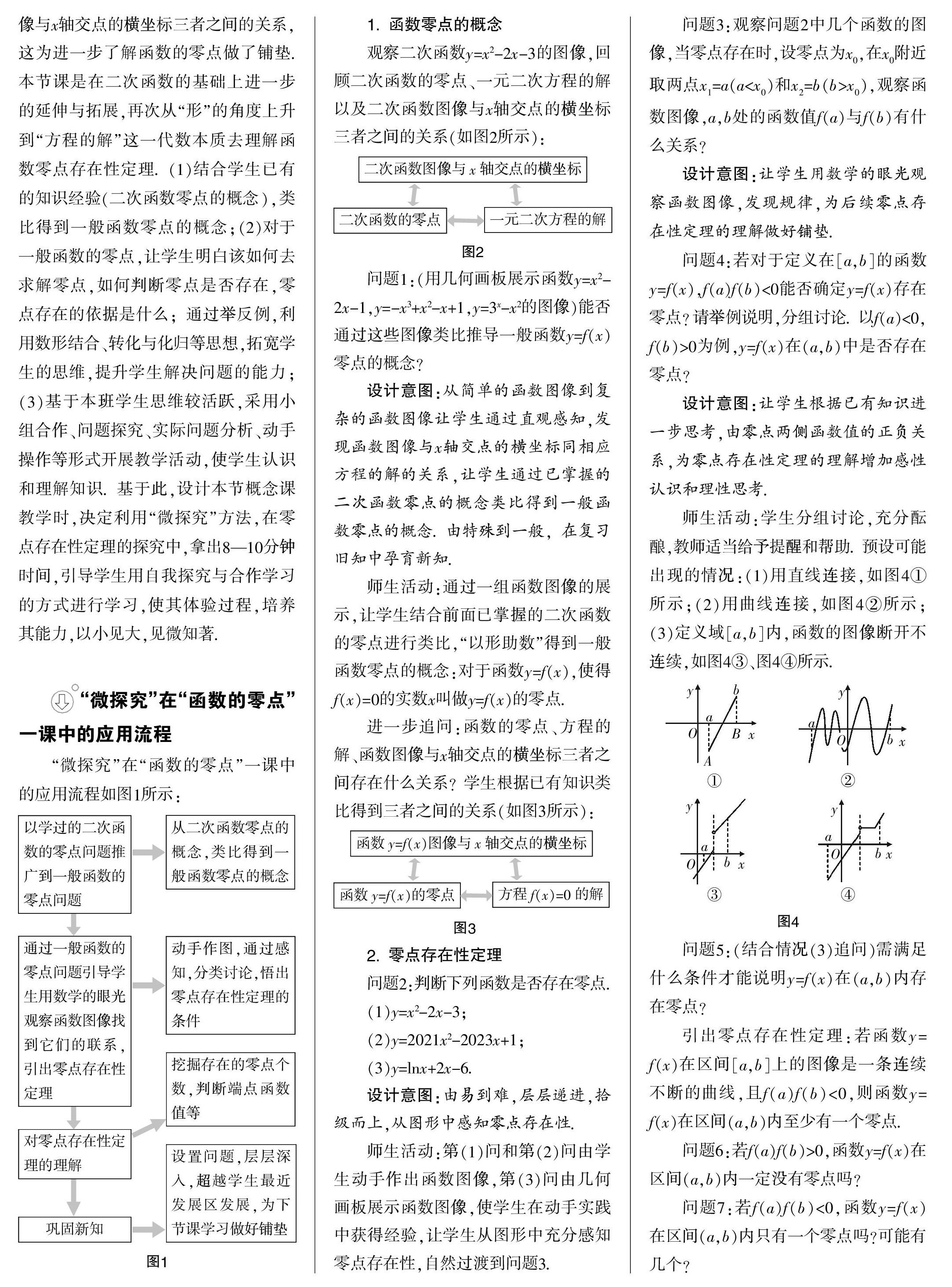 [摘 要] 文章以“函数的零点”一课为例,通过“微探究”方法,展示知识的生成过程,以及知识点之间的联系,让学生在探究中体验感受、建构的过程,从而更好地突破教学难点,加深学生对概念的理解与应用.