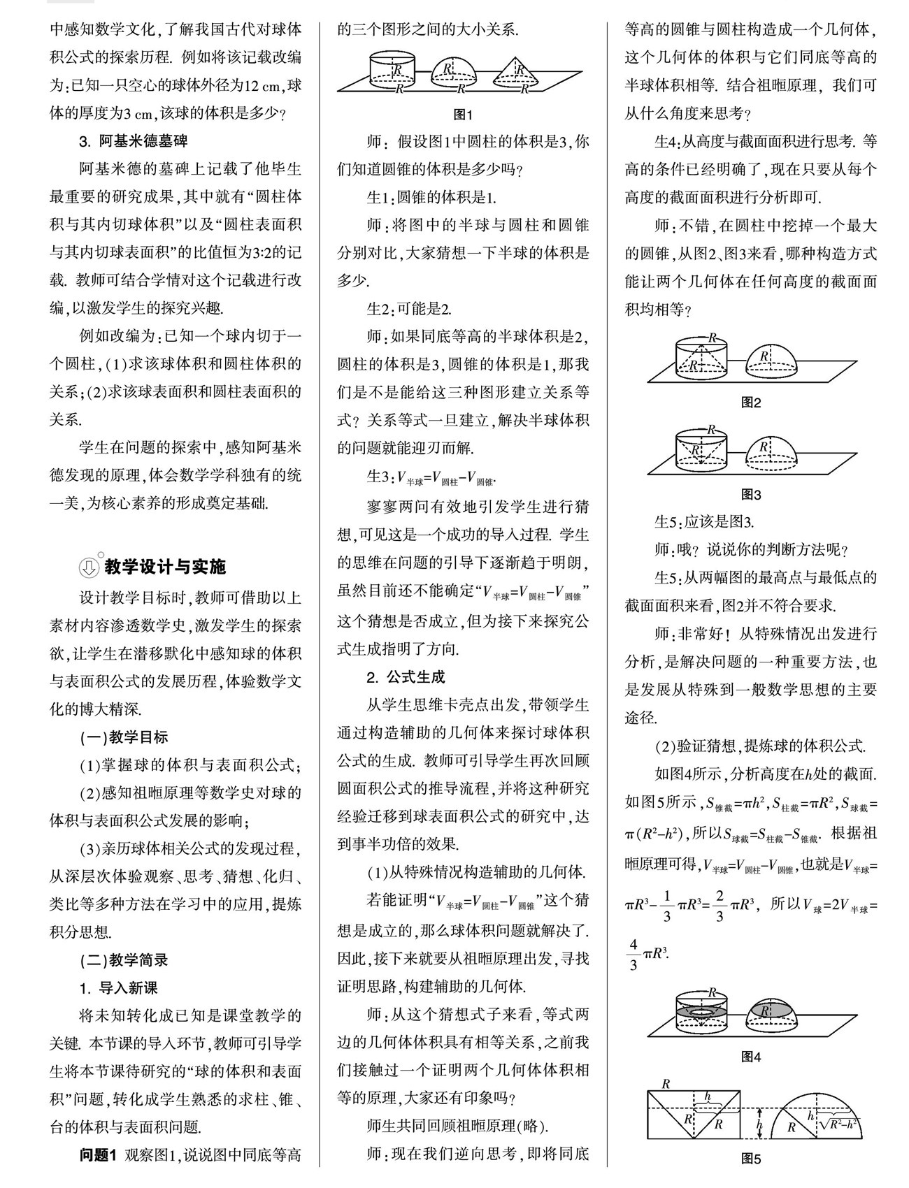 [摘 要] 当今中国的教育事业在“立德树人”理念下得以迅猛发展,培育学生的学科核心素养是践行这一理念的关键,数学史的应用是促进数学核心素养形成与发展的重要因素之一. 文章以“球的体积和表面积”教学为例,从史料的选择与加工、教学设计与实施、教学思考等方面谈一谈实践与想法.